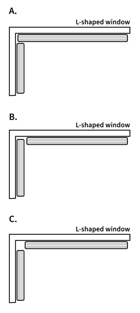 C. This option does not work for all corner or box-bay windows. If the window frame in the corner is very small, we recommend using method A. or B. instead, to make sure that the roller blinds will cover the glass area.