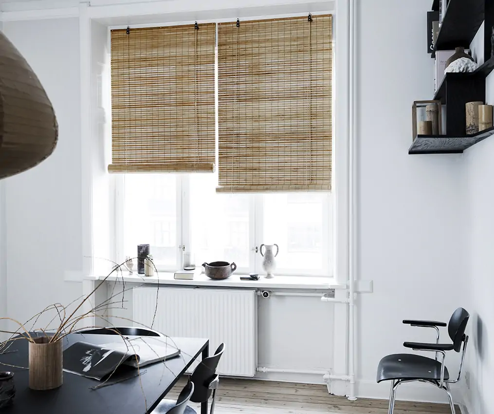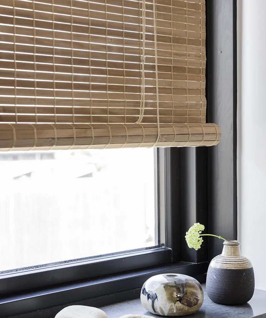 A light brown bamboo roller blind. An incredibly beautiful blind that is woven with slats of about 1.5 cm in width and fine, beige thread. The bamboo has been heat-treated in a way that really brings out the bamboo’s structure in the slats. A fantastic blind that brings a warm and natural feeling to your home.